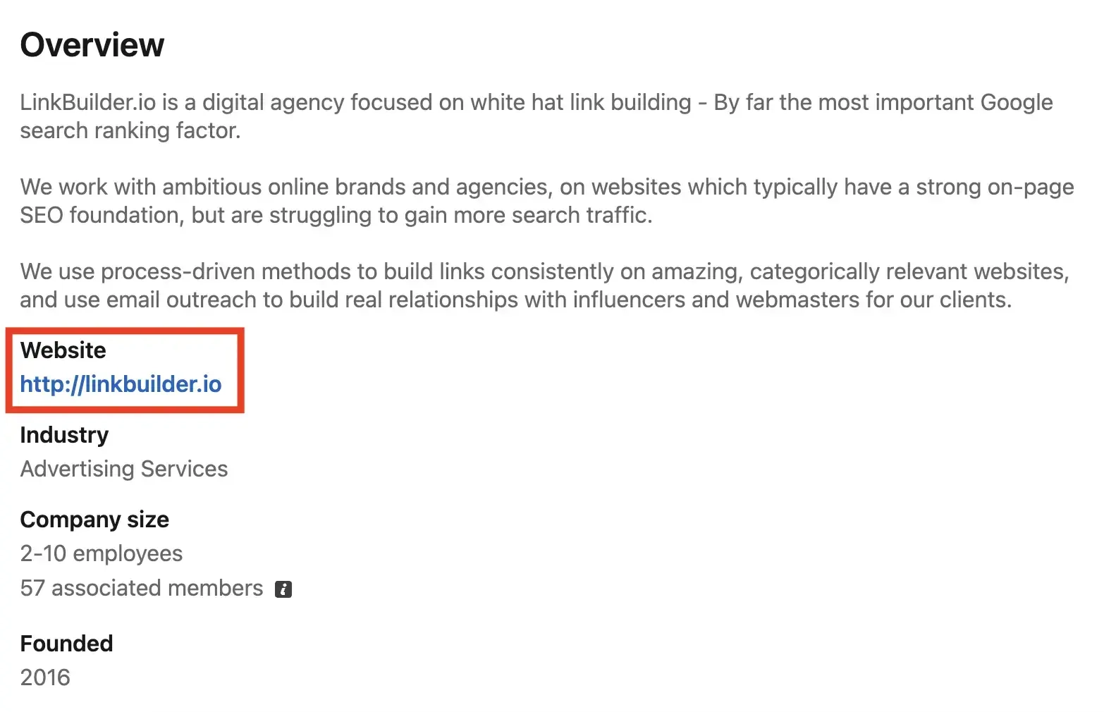 Here’s an example from us at LinkBuilder, where we’ve included our website URL in our LinkedIn profile: